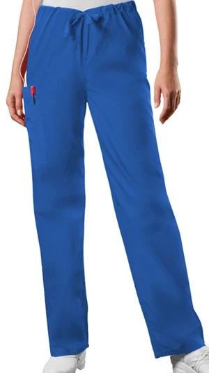 A casual Unisex pant features a natural rise and an adjustable webbed drawstring at the waist, one back pocket, and a cargo pocket with an inside cell phone pocket. Inseam 31″.