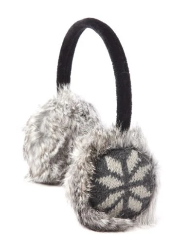Snowflake patterned lambswool rabbit trimmed earmuffs with non-adjustable velvet covered earband.